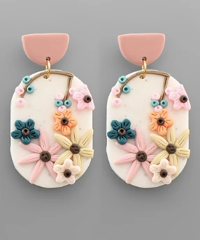 Floral earrings are a must have this season! We are loving this trendy white oval shaped clay pair, with 3D flower design. They are perfect for all of your upcoming events! Colors: mauve, peach, navy, teal, and light yellow