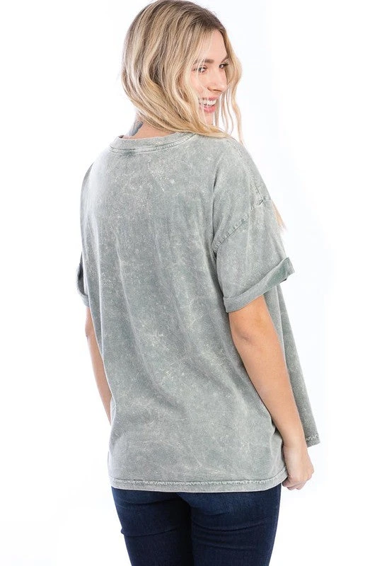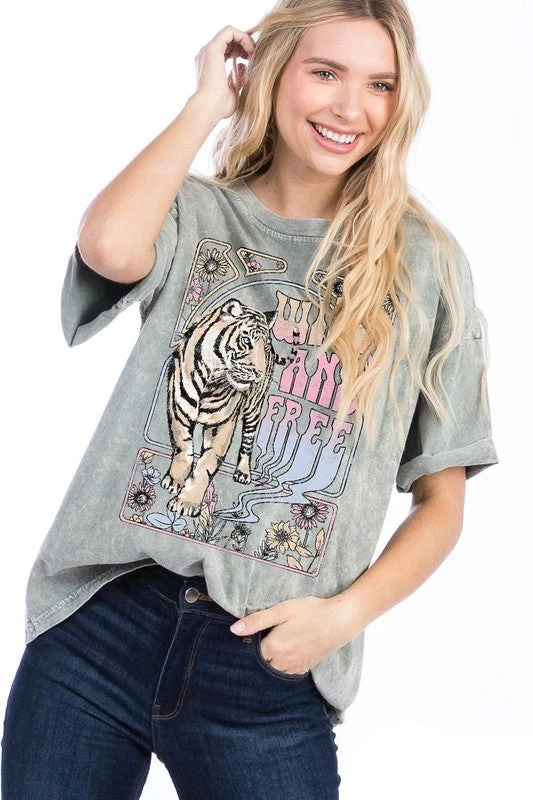 Trendy little must have tee! Snow-dyed grey graphic tee featuring a boyfriend fit, crew neckline, rolled short sleeve cuffs, and a tiger printed next to the words Wild And Free in a colorful vintage print. Perfect with some biker shorts!Â