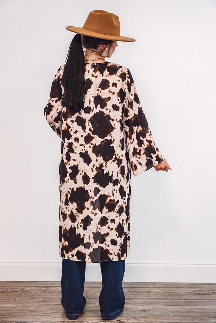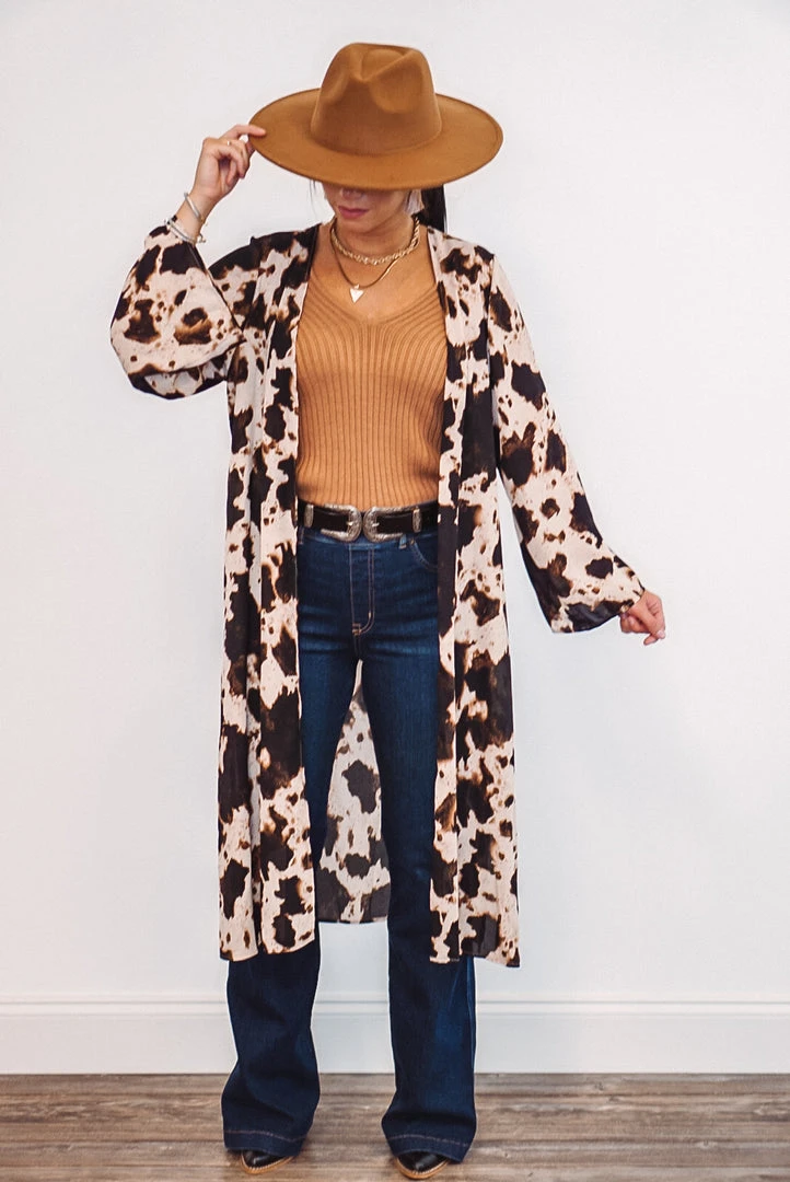 We are feeling all the western vibes with this fabulous duster! Light weight flowy fabric with animal print colors of tan, black and beige. Featuring long sleeves, a relaxed flowy fit, and side slits. She will soon become one of your favorites. Perfect for all seasons, you will love her year round!