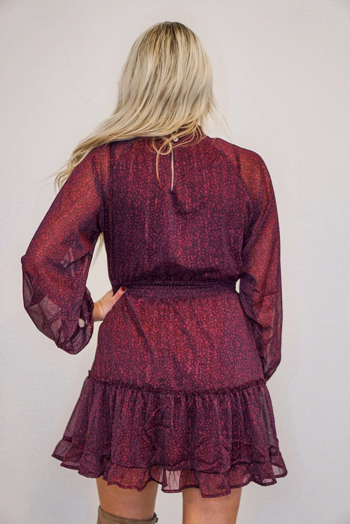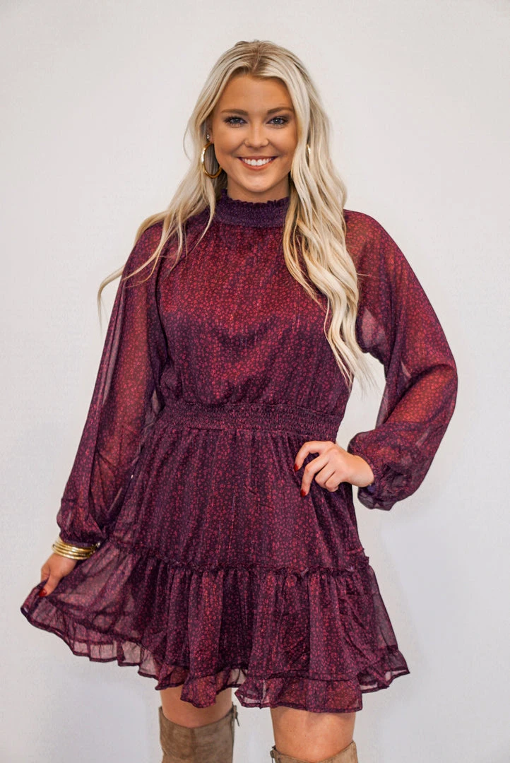 Oh my, oh my!! This babe is soooo cute! Wine colored dress with berry floral print pattern. Featuring double button keyhole closure in back of the smocked mock neck, elastic cuffed long sheer balloon sleeves, a smocked waistline, ruffled bottom hemline, and gold metallic stripes woven throughout for just the right amount of shimmer. Perfect dressed up for all your upcoming events… such a pretty addition to any closet!
