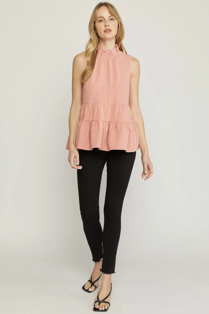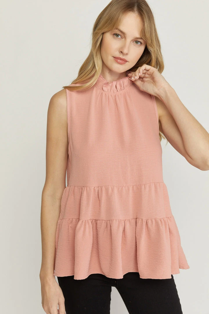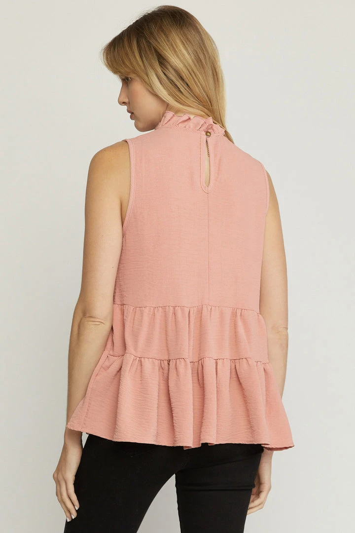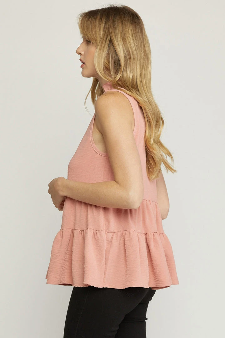 The perfect little babydoll top for all of your upcoming occasions… just add your favorite jeans and sandals or booties and you’re set. Sleeveless solid tank with a ruffled mock neckline, keyhole button closure in back, and tiered layers. So cute!