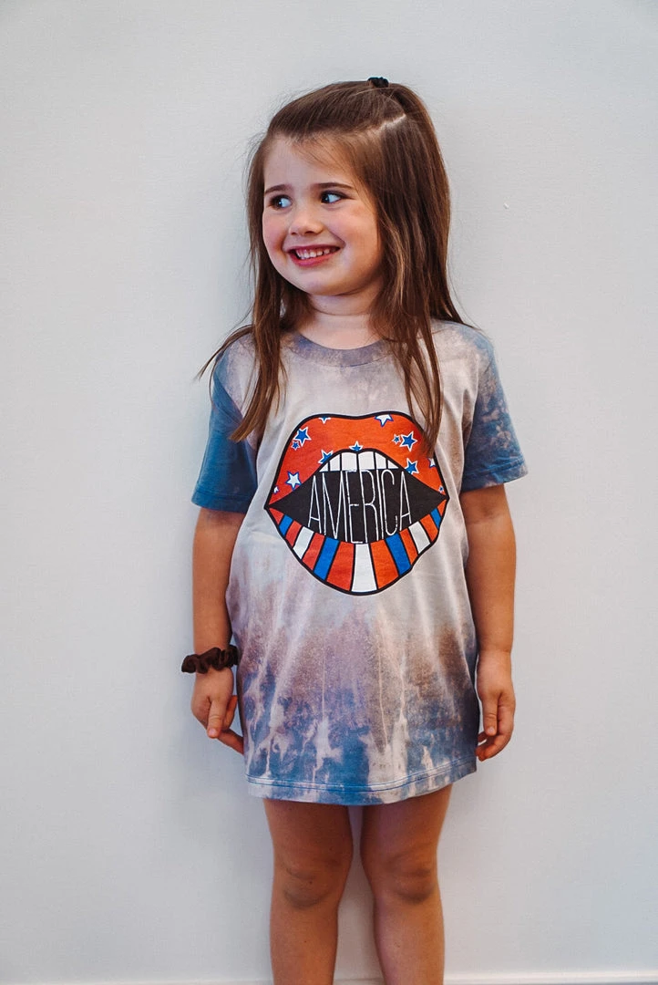Only the cutest America graphic tee for July 4th! Blue tee features America stars and stripes design. Match with your little and shop adult sizing HERE!