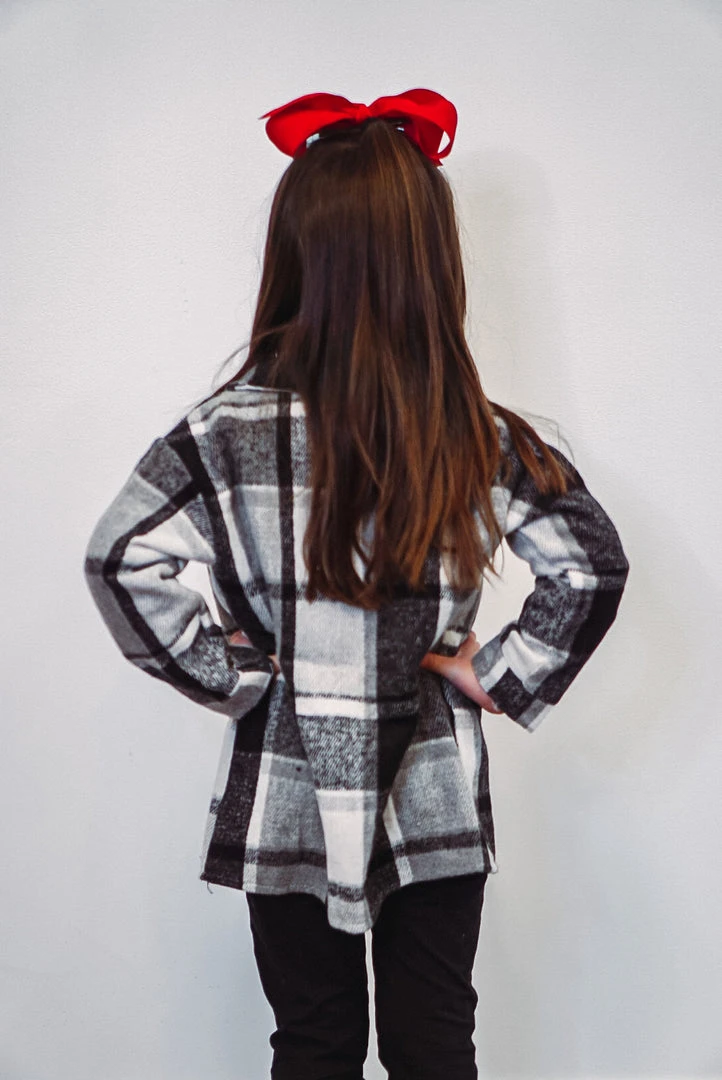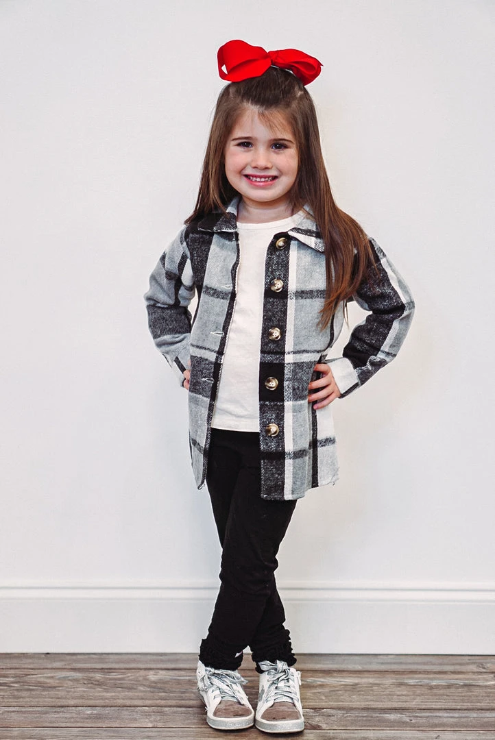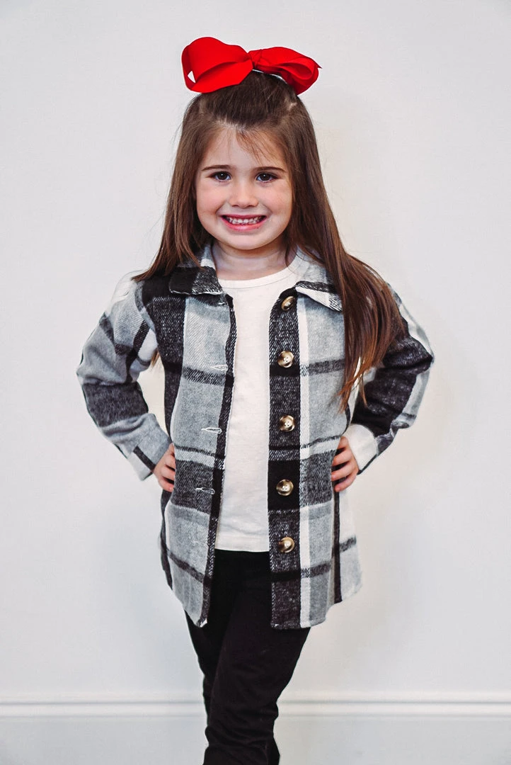 We are loving this black, white and grey plaid flannel shacket, it’s a must have trend this season for your mini me. It features soft fabric, button up style, and mid weight fabric to keep her warm and cozy.