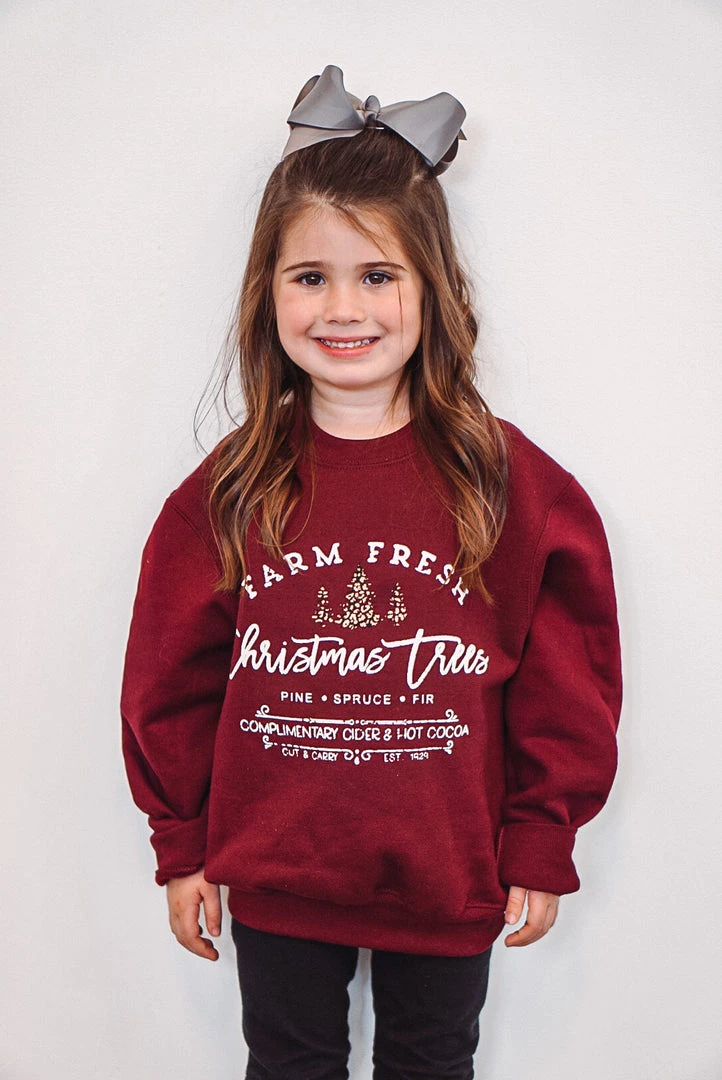 Heathered burgundy Christmas tree farm graphic sweatshirt in youth