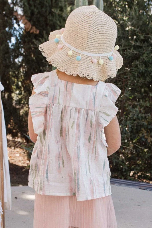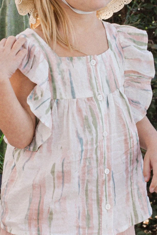 Your little one will love this cute ruffled top! Watercolor printed fabric, featuring a square neckline, ruffle capped short sleeves, and buttoned front. So adorable! Colors: Off white, light pink, and light olive