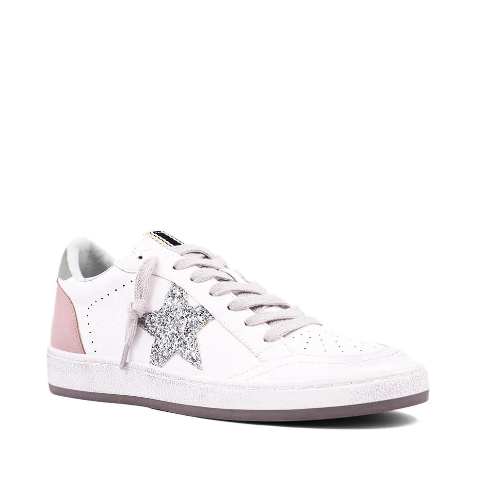 Meet one of new favorite sneakers. Paz, from SHU SHOP is an effortlessly cool pair of white and pink leather sneakers with a shiny silver glitter star. These sneakers are lightweight and comfortable enough for everyday wear, whether you’re headed to the gym or brunch with friends. The Paz sneaker features a white leather shoe with pink and green suede on the heel with a silver glitter. Comes with grey and pink laces.