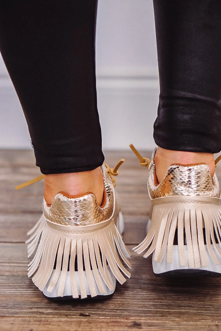 Shu Shop Pepa fringe faux leather gold sneakers.
