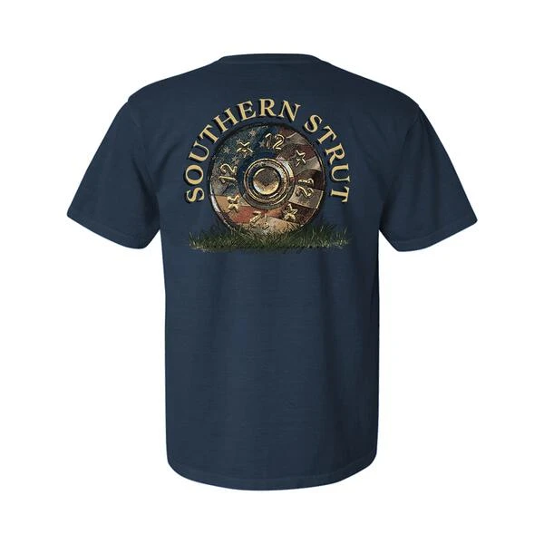 Southern Strut brand 12 gauge american flag navy short sleeve t-shirt.