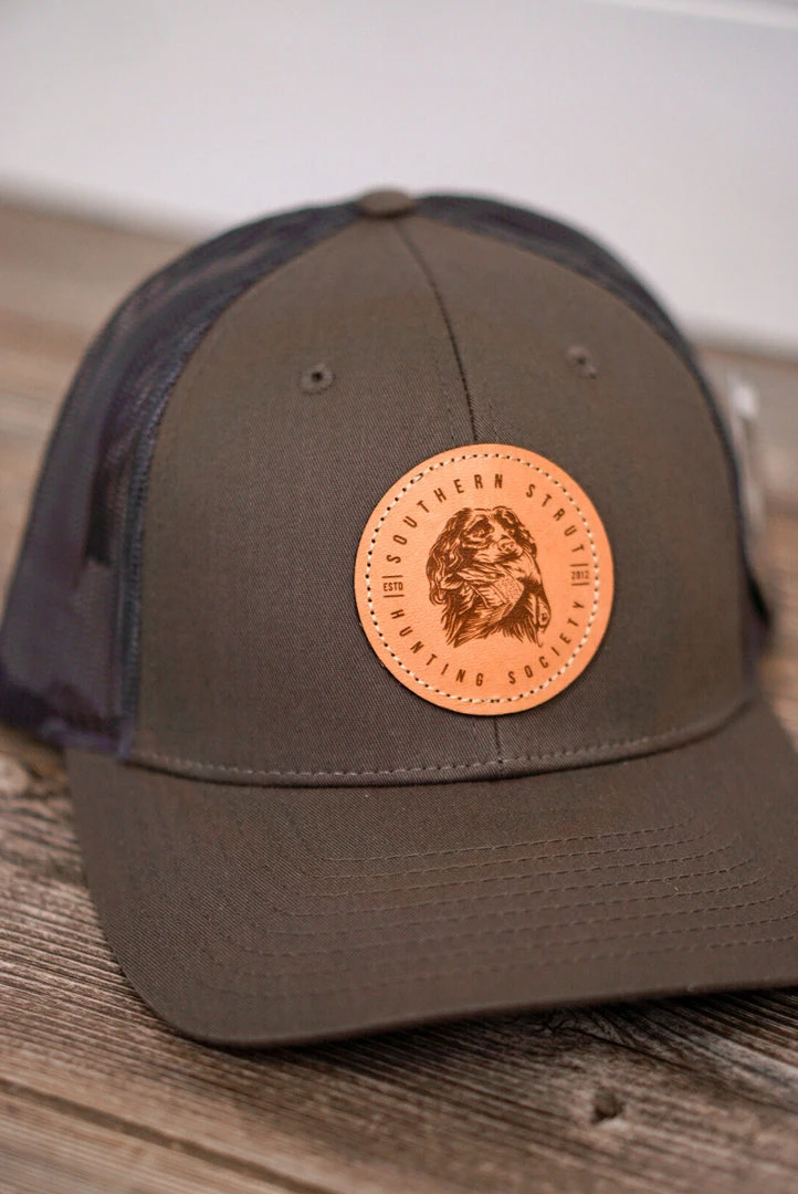 Southern Strut men’s trucker hat. Faux leather boykin patch