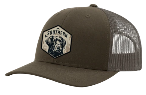Chocolate chip/grey brown hat featuring a hexagon shaped patch with a black line art lab dog sitting in brown cat tails. There are ducks in the sky as well as the words “Southern Strut”