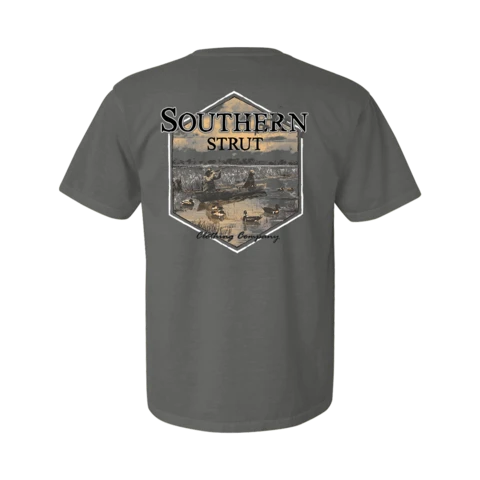 The Marsh Hex shirt features a man and his dog, hunting in a southern marsh. The top text reads “Southern Strut”.