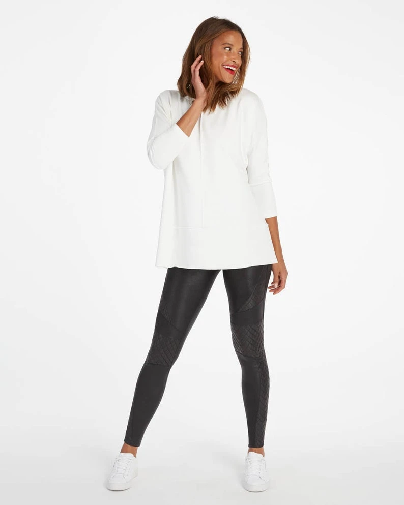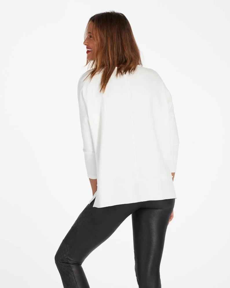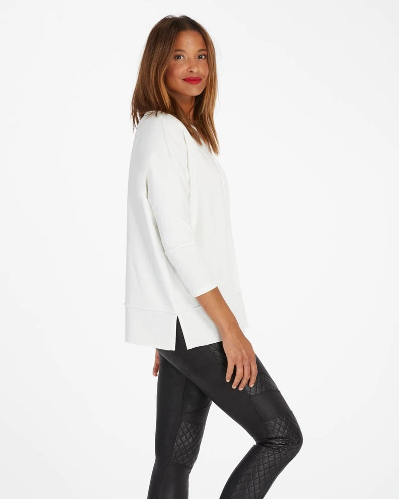 This powder color go-to top was designed with incredibly cozy fabric that feels like your favorite sweatshirt (but with elevated style). Even better, there’s just enough length to cover your front and back, making it the ideal match for leggings.