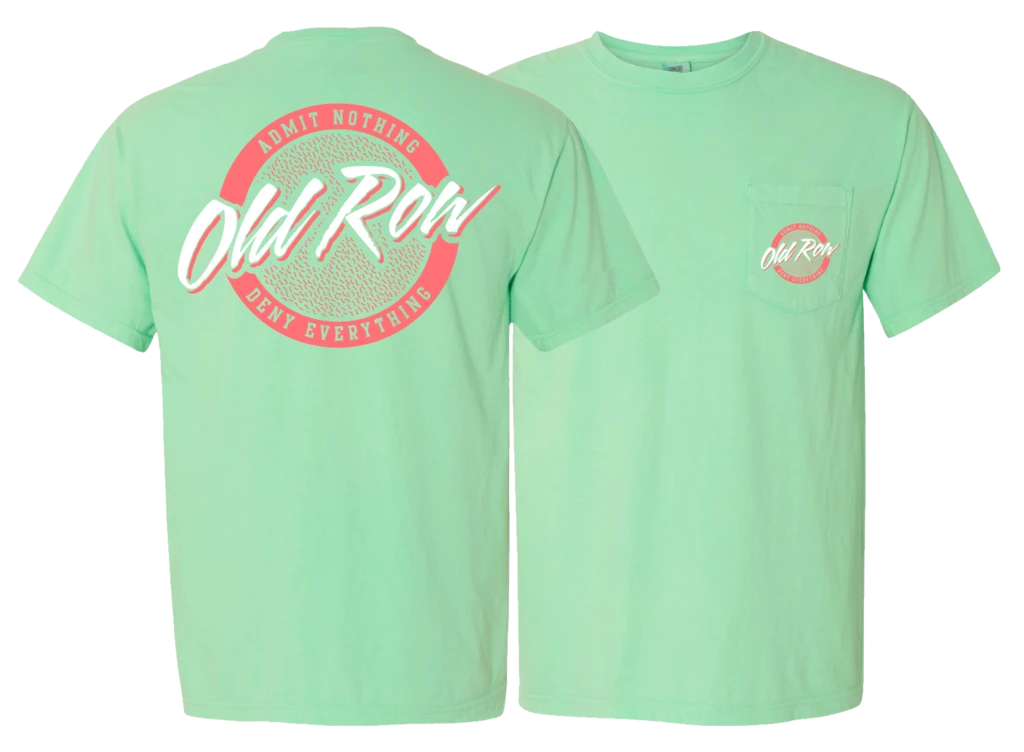Show your Old Row Spirit in this island reef green T Shirt with white and coral pink circle logo. We love our Old Row!