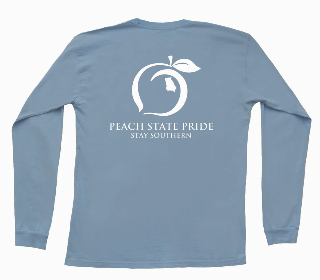 The Peach State Pride cotton long sleeve pocket t-shirt with a classic fit featuring Peach State Pride Classic Stay Southern Peach Logo.