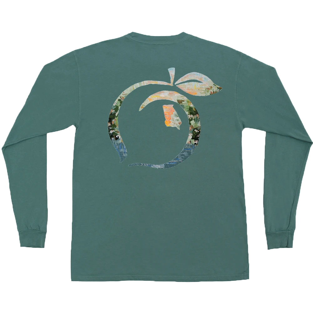 “Our Peach design celebrates Georgia’s vibrant natural beauty. This tee features our classic Peach State Pride logo hand painted by Georgia native Lucy Reiser Chapman.”