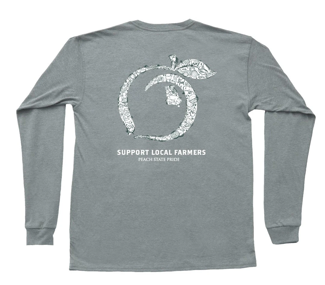 The Peach State Pride cotton long sleeve pocket t-shirt with a classic fit featuring the Support Local Farmers design.