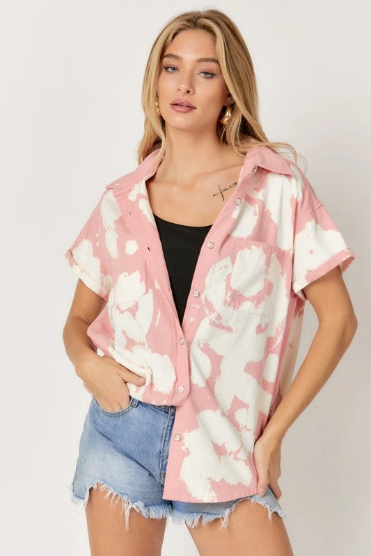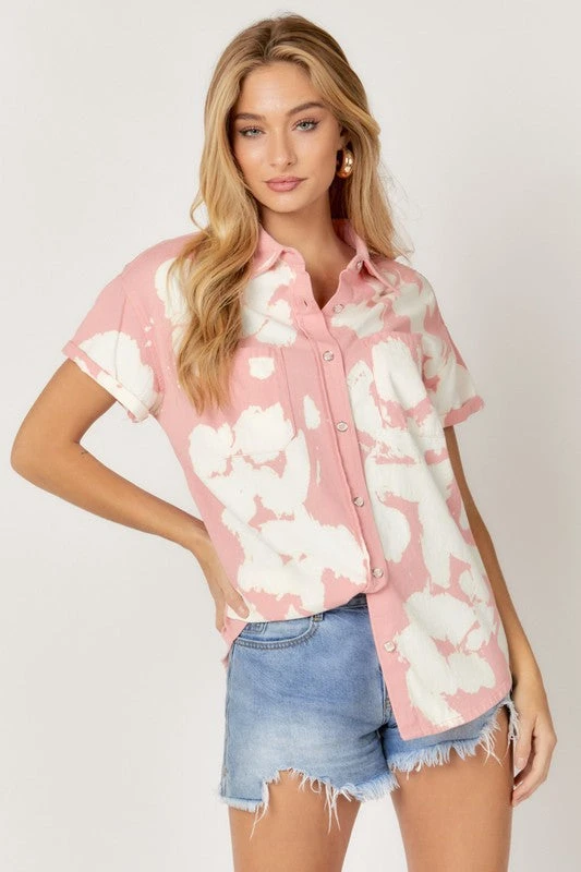 A very trendy twist to your average button down! This cutie is blush and ivory cloud washed lightweight denim in a button down style, with permanently rolled short sleeves, two front chest pockets, and rounded bottom hemline. She’s a relaxed fit and very comfortable. So cute alone or unbuttoned over a fitted tee for a shacket look!