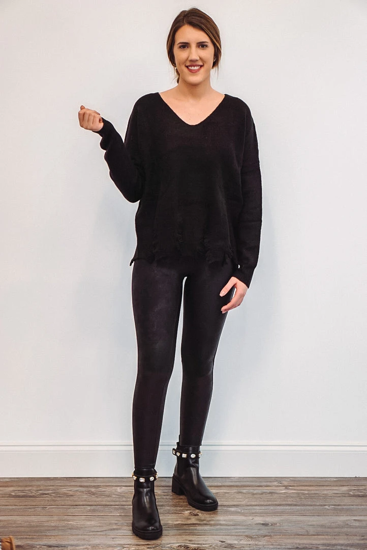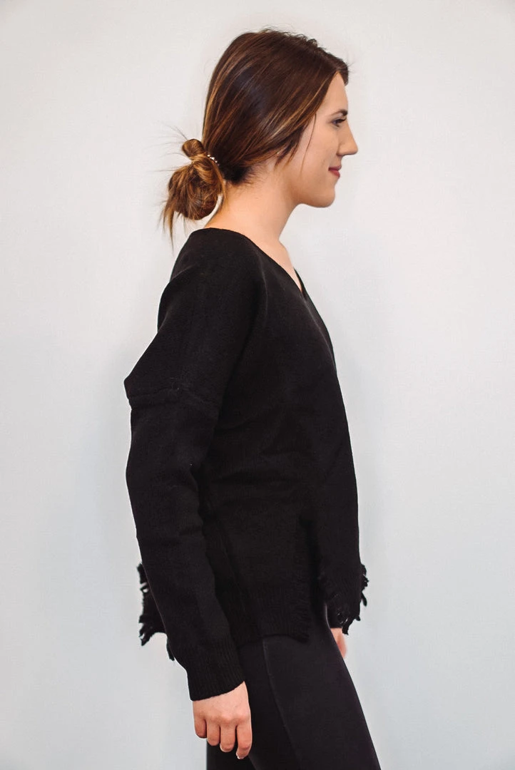 Black knit long sleeve distressed sweater