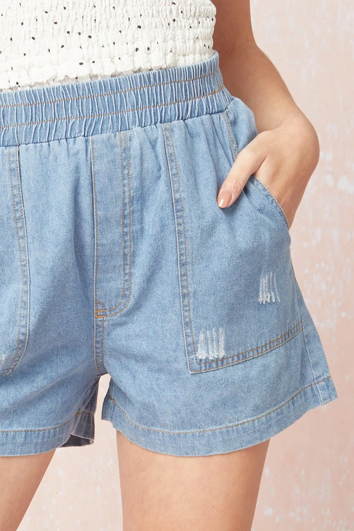 Women’s lightweight chambray denim shorts with stretch elastic waistband.