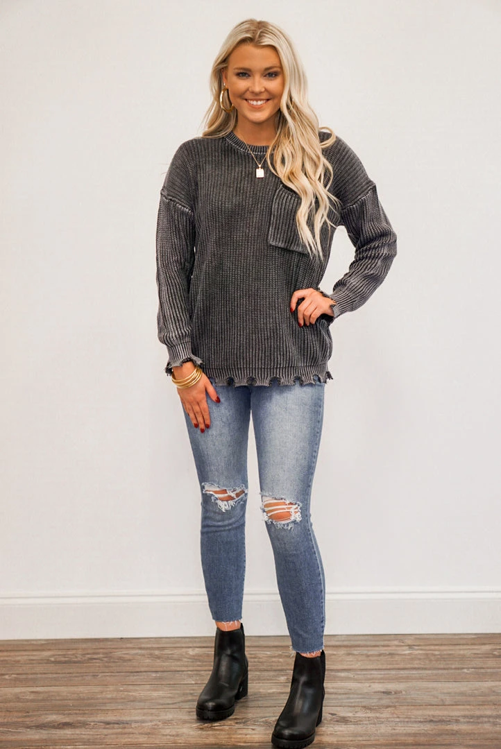 We know you’re going to love this cozy charcoal sweater! Featuring a mineral washed chunky knit, crew neckline, a front chest pocket, and distressing on the bottom hemline and the cuffs of the long sleeves. The color is so pretty, and the fabric is perfect for the upcoming chilly weather. Love this paired with distressed denim and some boots for a perfect Winter look!