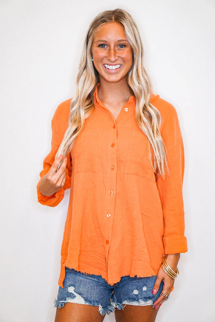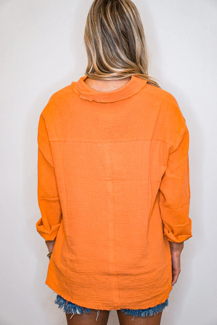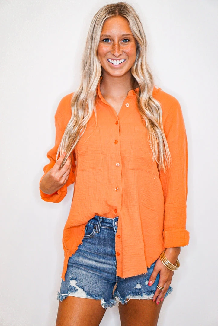 Orange button down crinkle gauze top