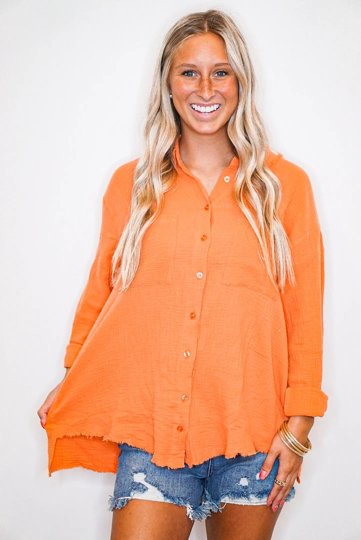 A super cute twist to the average button down! This babe is orange lightweight gauze fabric in a button down style, with tiered detail in back, hi-low bottom hemline, and raw seam details. She’s a relaxed fit and very comfortable. Wear her as a layering piece for those chilly evenings out, or as a swimsuit cover on those hot Summer days. She’ll be perfect either way!