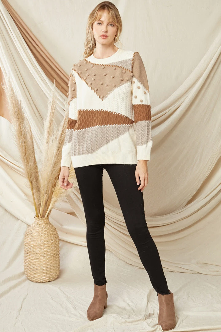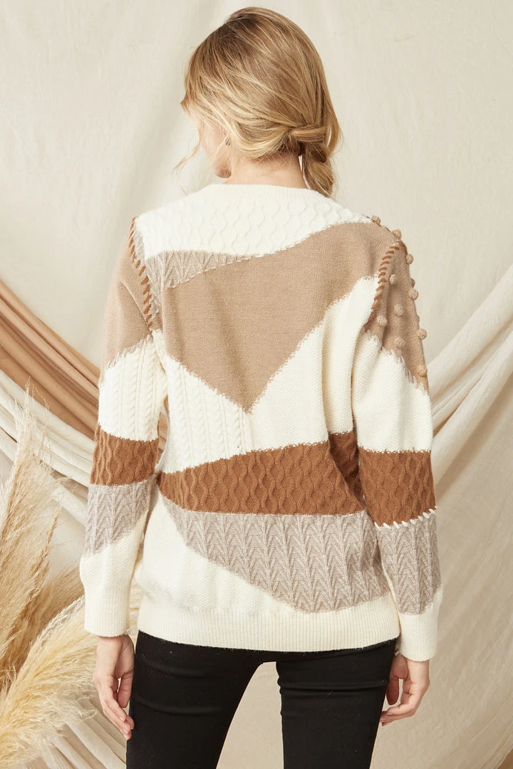 How cute and fun is this pom pom sweater?! Featuring a crew neckline, and long sleeves. The colorblocking consists of different textures as well as different colors, and is outlined with stitch detailing. The top colorblock portion has added sass with pom pom details! Love this paired with distressed denim and some boots for a perfect Winter look! Colorblock colors include caramel, ivory, tan and mocha.