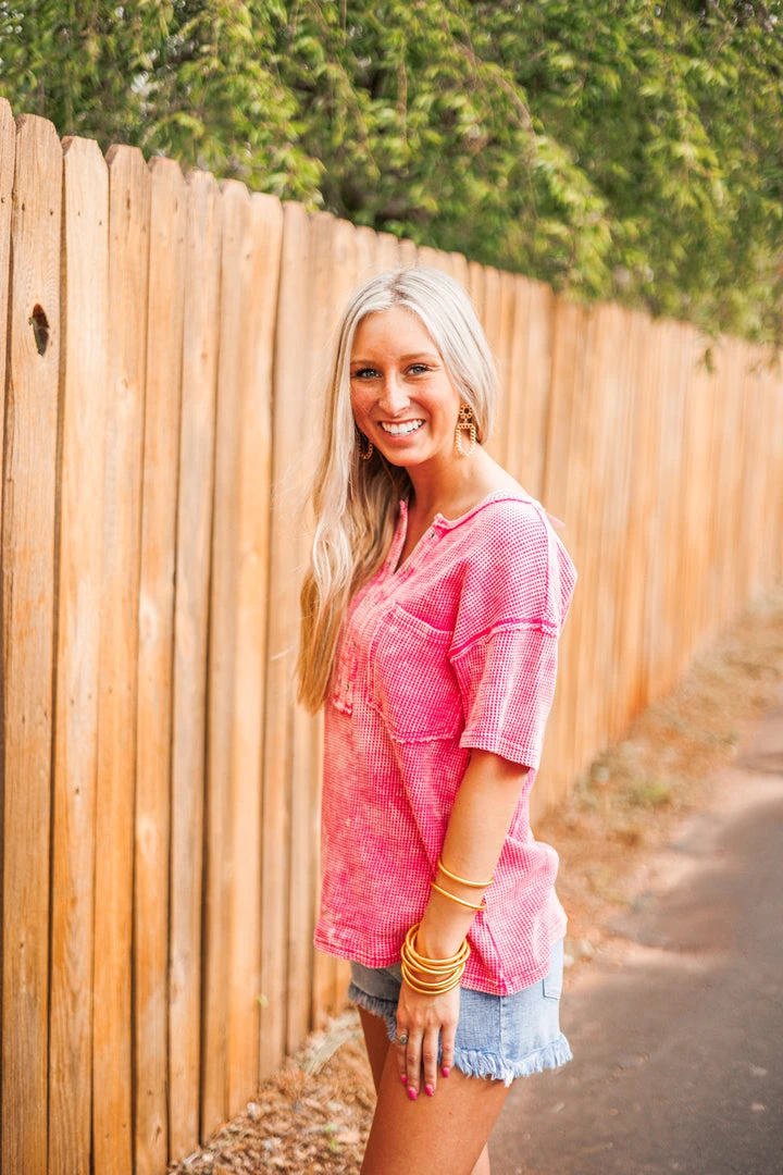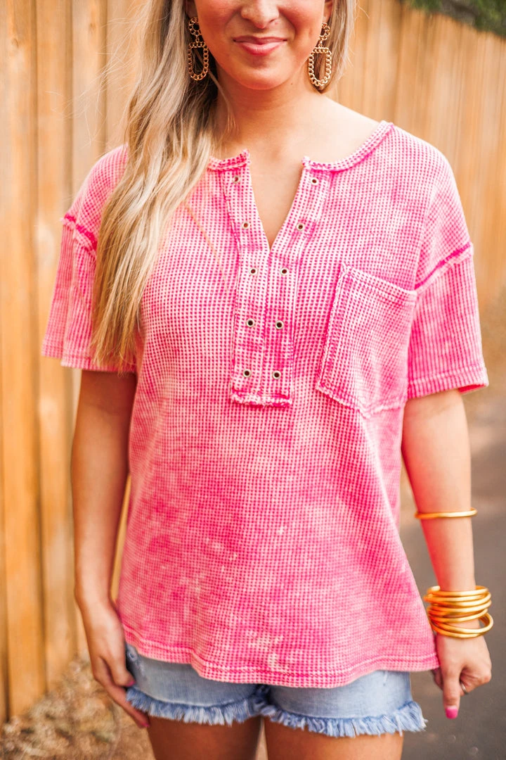 A very trendy twist to your average waffle knit top! This cutie is fuchsia mineral washed, giving it a very vintage appearance. Featuring a v neckline with an eyelet placket, a front chest patch pocket, and raw seam details throughout.