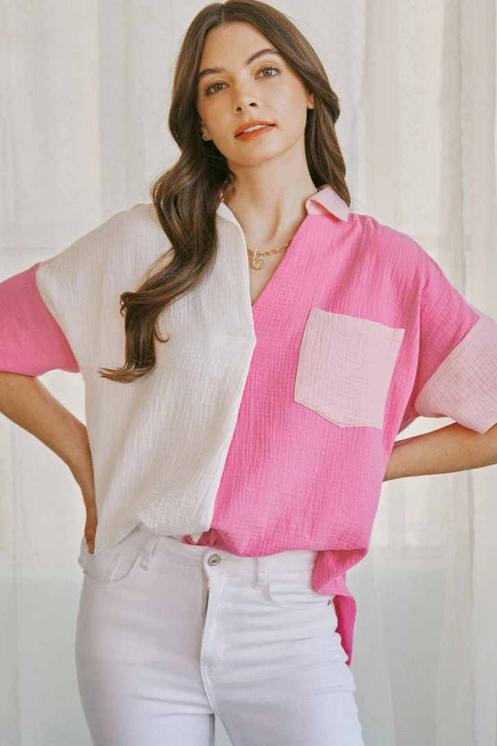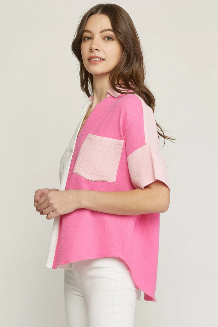 A very trendy twist to your average Summer top! This colorblock cutie is fuchsia, light pink, and white lightweight gauze fabric, with a collar, and super cute button detail down the back. She’s a relaxed fit and very comfortable. Perfect worn down straight, or with a front tuck!