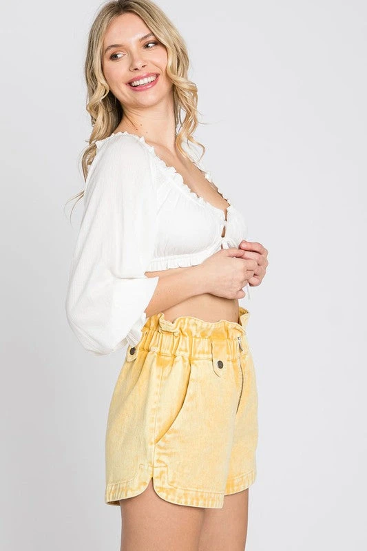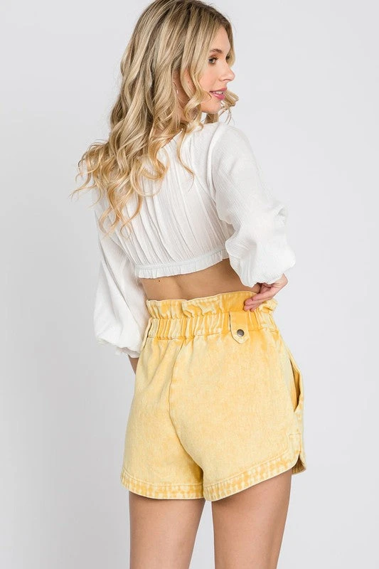 We are in cuteness overload with these must have acid washed buttercup shorts! Dress them up or down. Either way, they are our new go-to shorts for summer! Such a flattering fit, featuring highwaist elastic paperbag waistband, zipper front closure, and front pockets. We love, love, love!
