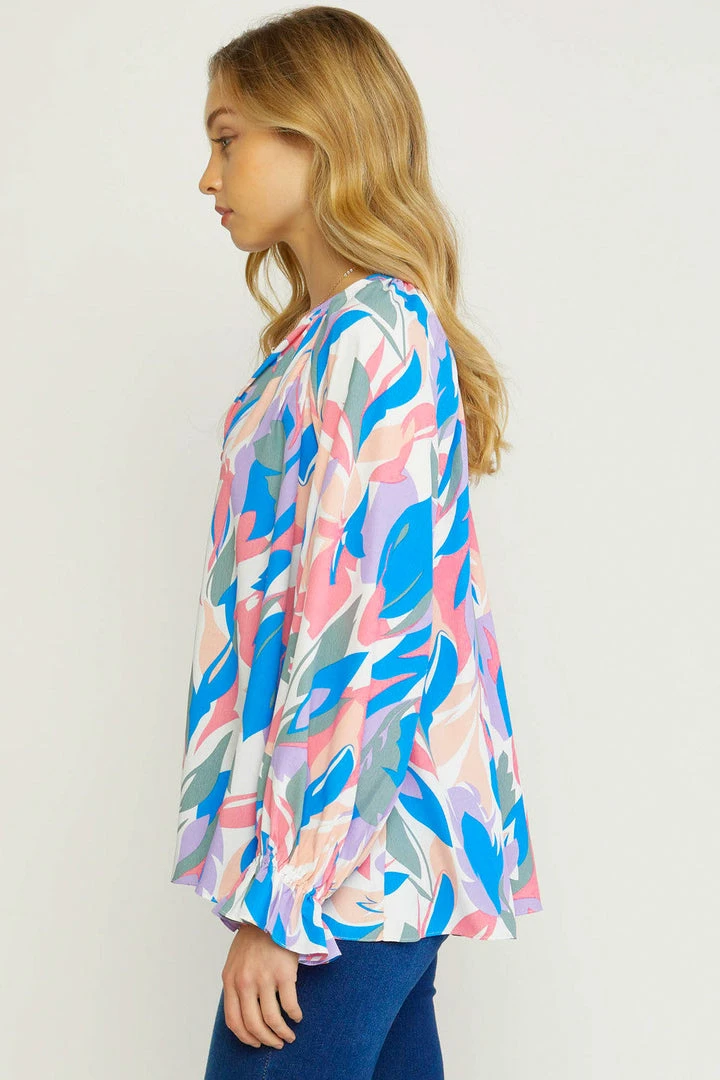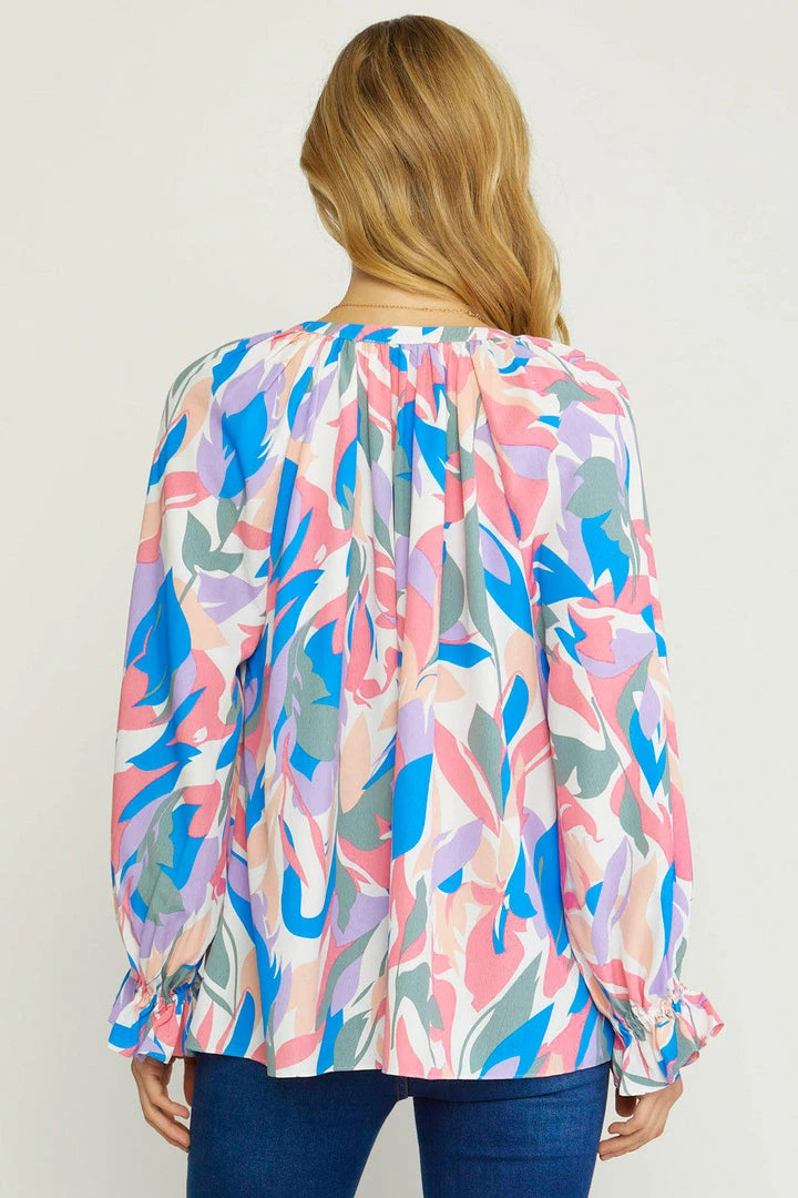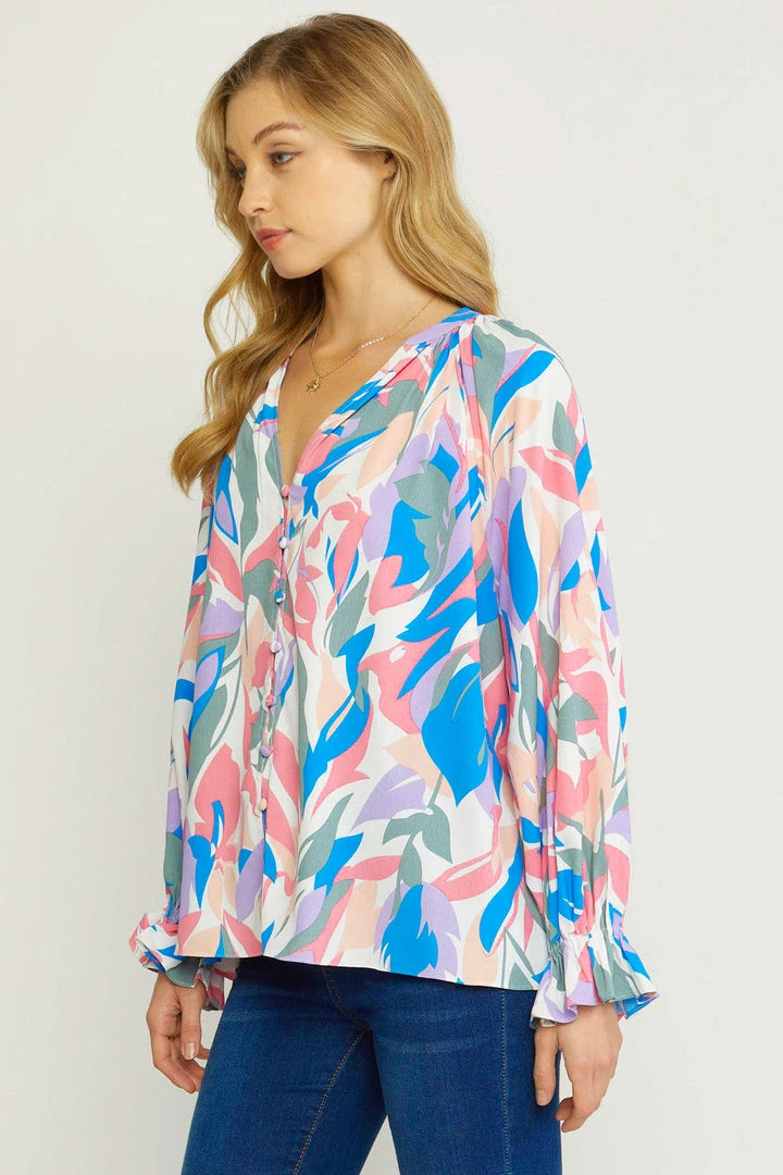 The top that you can’t live without! Wear this cutie everywhere! Featuring a pretty pastel print in a button down style, v neckline, elastic ruffle cuffed long sleeves, and fabric covered buttons that make this top ever so sleek and chic! Wear it loose and flowy, or do a center tuck. Colors: white, lavender, pink, peach, olive, blue.