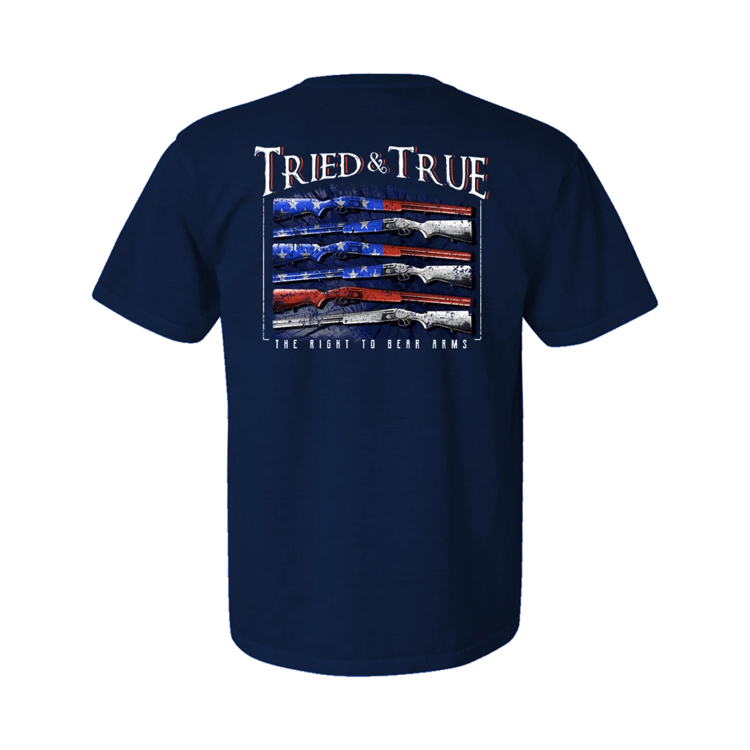 - Design: Printed on a Comfort Color True Navy colored t-shirt the Gun Flag Shirt Features alternating facing shotguns overlaid with the flag of the United States of America. The top text reads “Tried & True” and the bottom text reads “The right to Bear Arms”