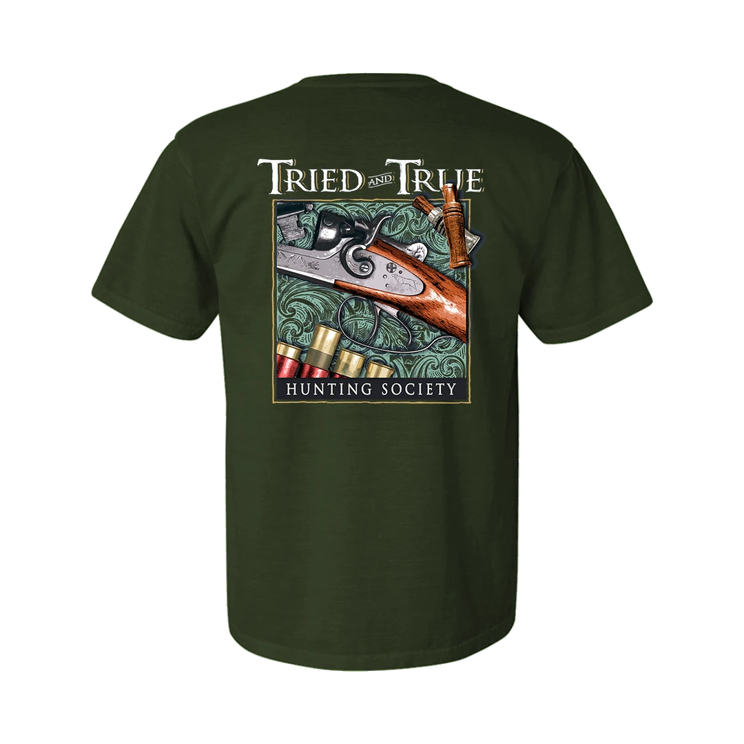 Design: Printed on a Comfort Color moss colored t-shirt, a design containing an old side by side polished new and it’s metal engraved dogs gleaming with wooden duck calls to the top right corner and shells in the bottom left. Framed with the Tried & True signature waves in the background and “Tried & True” as the header and “Hunting Society” the footer.