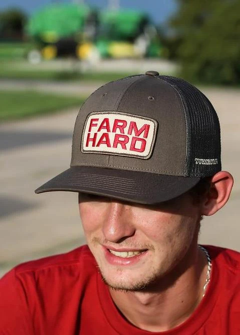 Mesh back trucker hat, structured fit. Farm Hard patch. Richardson trucker hat.