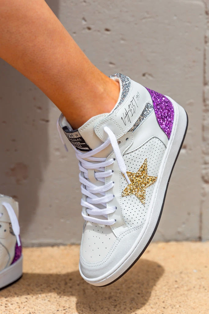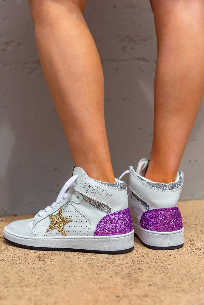 This multi colored sneaker is a must have. The Vintage Havana Dream high tops are a slip-on designer sneaker with a trendy athleisure style featuring a lace-up design and fun glitter detail. A trendy white hi top design with a gold glitter star and a purple glitter heel. Pair with jeans, leggings, skirts or shorts – a versatile pair of sneakers for any occasion!