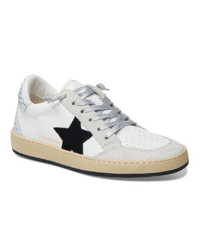 The trendy, edgy black star and the silver shoe laces give this classic sneaker a whole new vibe and we are loving it! This is going to be a new favorite of yours. These sneakers are sleek, comfy and on trend! Very versatile, pair them with denim, dresses, joggers or shorts for a comfy trendy look. White sneakers with black star detail and elevated sole. Cushioned insole. Terry lined.