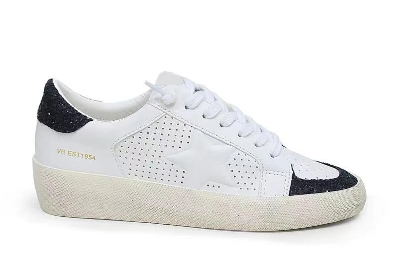 Fashion sneakers like no other, these women’s shoes will become your next favorite!! The black glitter on the heel and toe adds a little somethong extra to these trendy white sneakers. Wear these to dress up any casual outift.