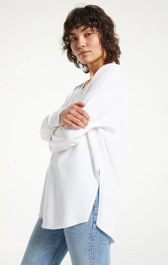 A new Weekender silhouette to love! The V-Neck Weekender features our much loved oversized design, given a flattering new v-neckline, with exaggerated side slits and a raw edge hem with ribbed accents. This easy-to-wear top will become a go-to fall favorite.